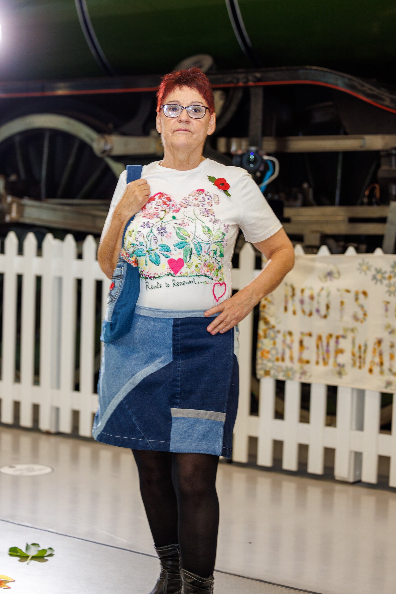 The show opened with a Roots to Renewal flower printed dress revealed by Miss Eco Pageant 2025, Charlotte Lister, followed by a vibrant flow of models wearing upcycled, embroidered, naturally dyed, and creatively crafted pieces showcasing the many sustainable techniques explored during the project. During a short interval that allowed for a low stress change, the audience enjoyed a beautiful performance by Sofia on electric guitar and then we got ready to go again as the audience responded with gasps and claps as Sammy opened the second half of the show, wearing their striking red dress and jacket, lovingly made by Estelle as part of a project with Right Up Our Street. This outfit had been showcased in the gallery earlier in the year, and it was wonderful to have it featured on the runway, giving Sammy the perfect opportunity to wear this amazing creation and for fill a life long dream; more fabulous outfits took the stage, including striking nature-themed pieces created earlier in the month and week at the gallery. The show closed with Charlotte wearing a beautifully decorated leaf dress and delivering a heartfelt speech about her role as Miss Eco Pageant 2025.
