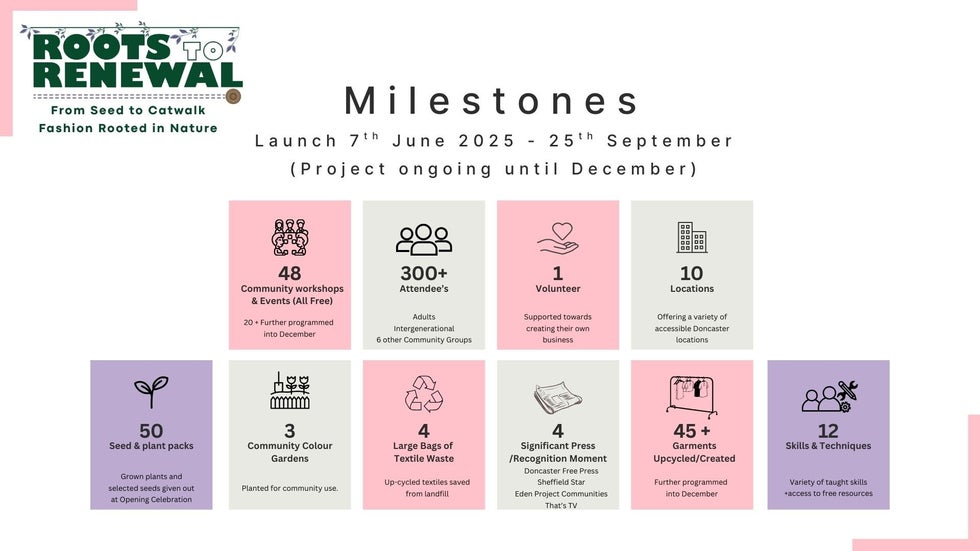 We are thrilled to share how well the Roots to Renewal project is progressing! To date, we have achieved incredible milestones together, delivering 48 workshops and events with over 300 attendees across 10 locations in Doncaster. We’ve successfully saved 4 large bags of textiles from landfill, created vibrant community colour and tea gardens, crafted beautiful catwalk-ready garments, and taught over 12 different skills and techniques. There is still so much more to come, and we can’t wait to celebrate everything we've accomplished with the community fashion show on Saturday 8th November at Doncaster Danum Gallery, Library and Museum. Thank you to everyone involved for being part of this inspiring journey!