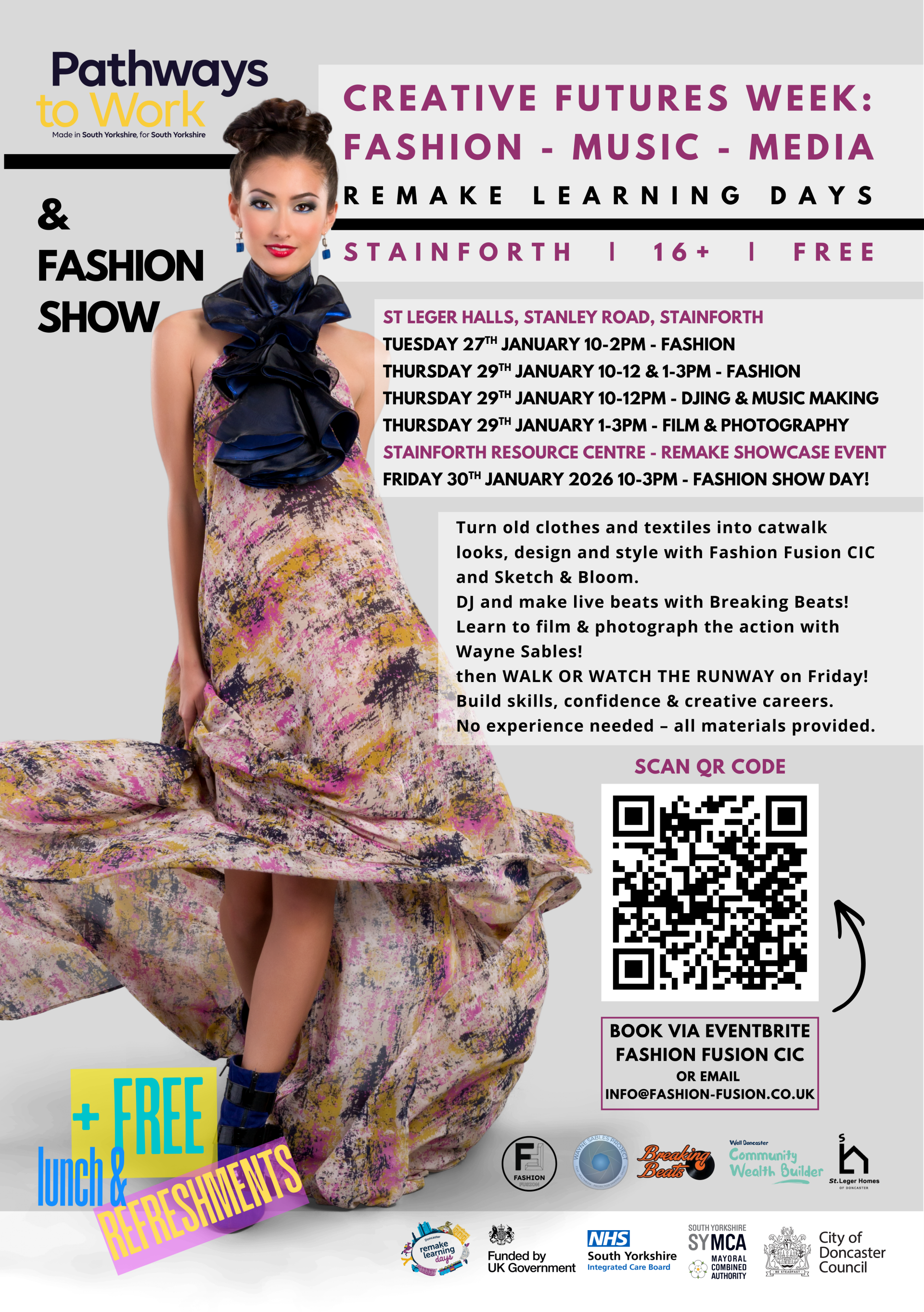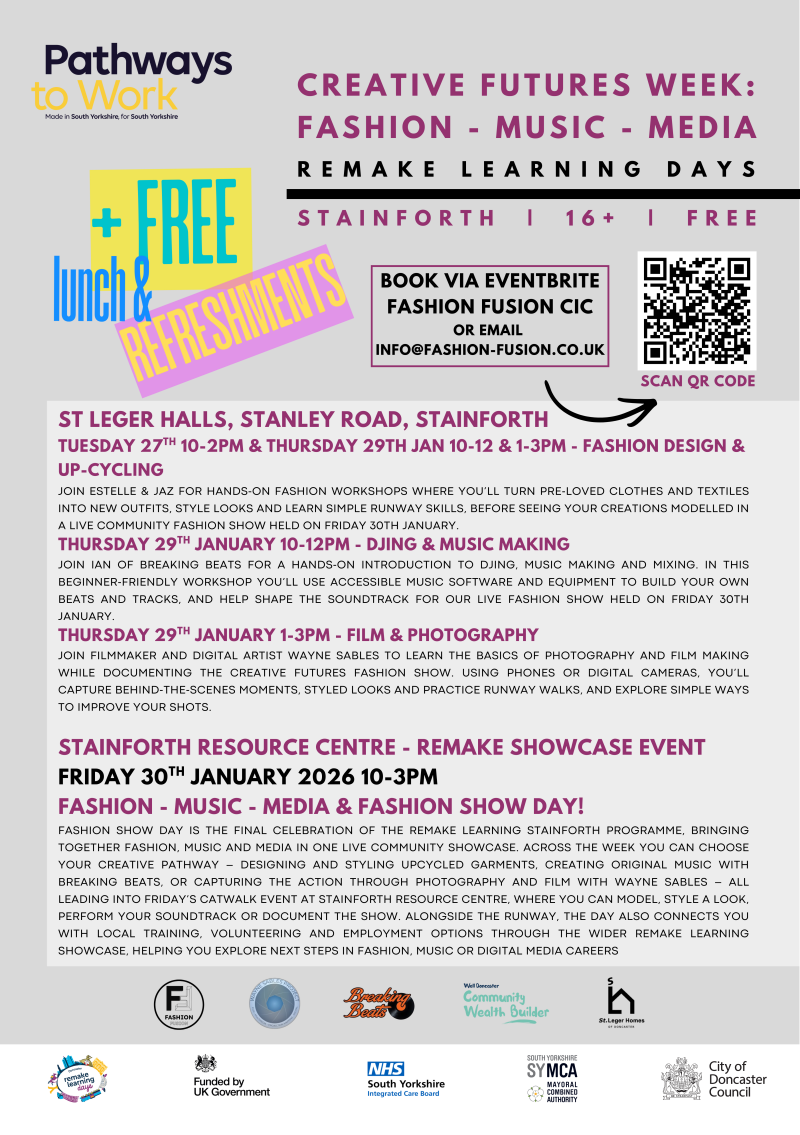 Creative Futures brings free workshops in fashion design & upcycling, music making & DJing, film & photography, styling and catwalk skills to Stainforth Resource Centre for anyone 16+.